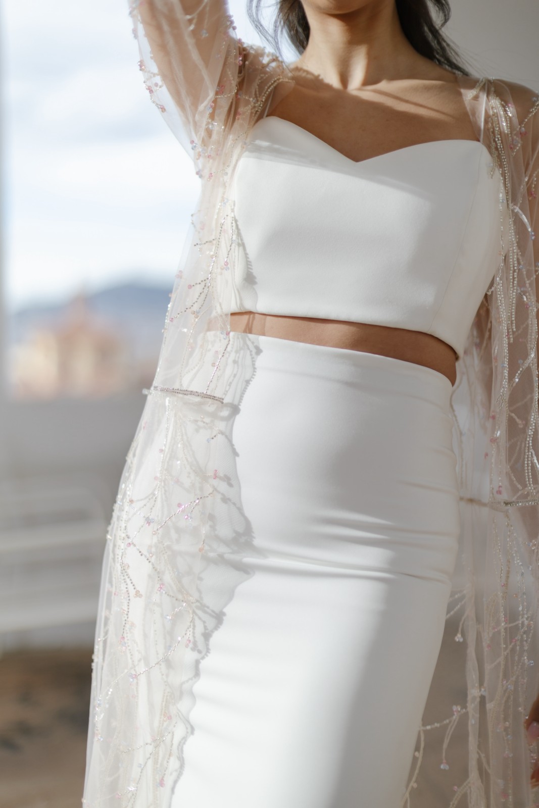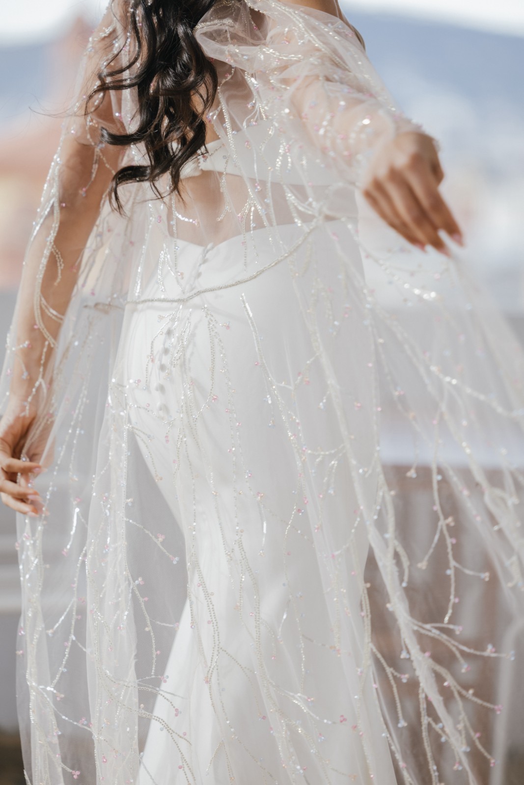 Capa de tul colo crema y largo XL con pedrería en colores pastel como el rosa, el coral o el azul. Ideal para combinar con nuestros vestidos y usar como complemento para tu boda y darle un toque de lujo a tu look.