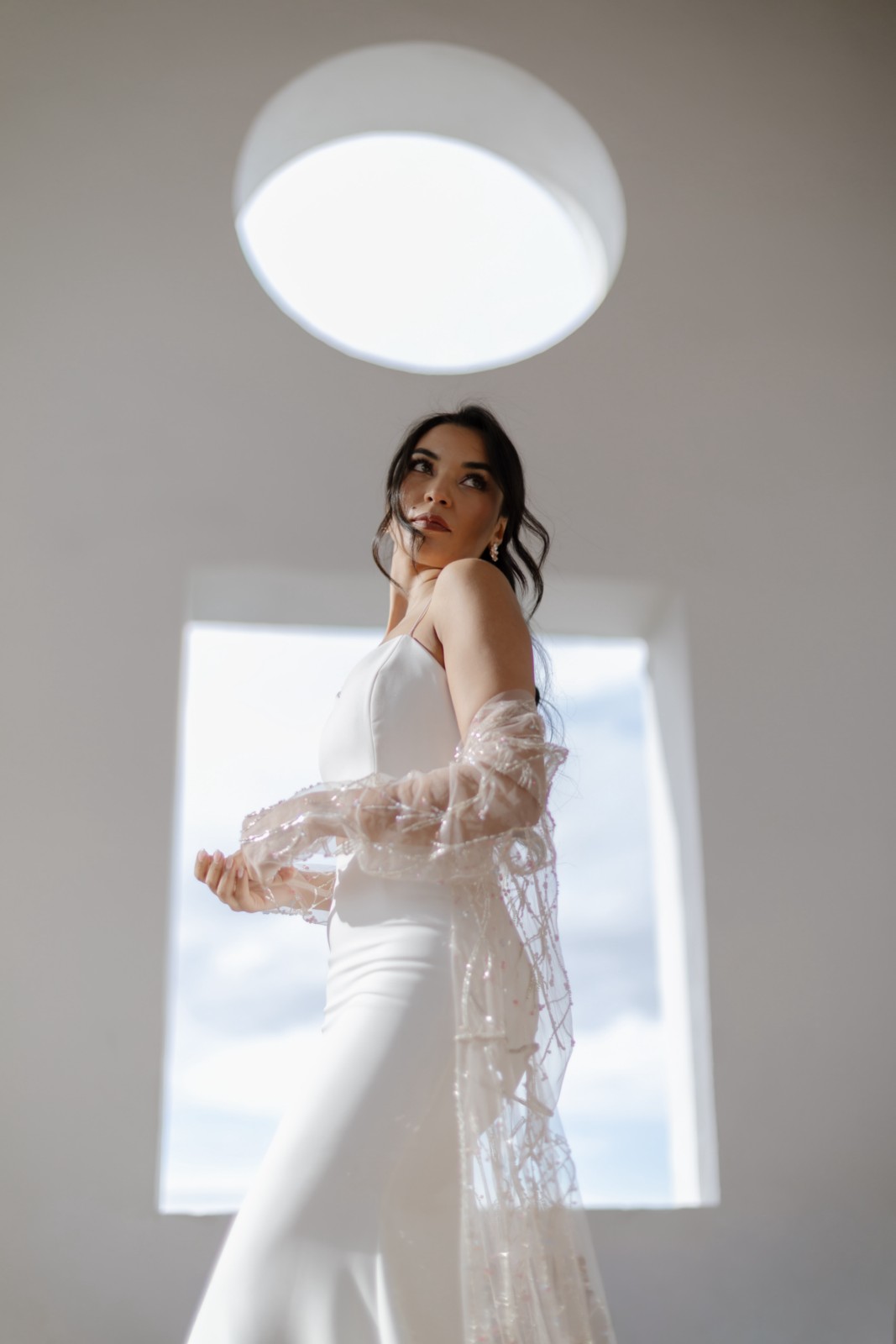 Confeccionado en tul bordado con pedrería de alta calidad.