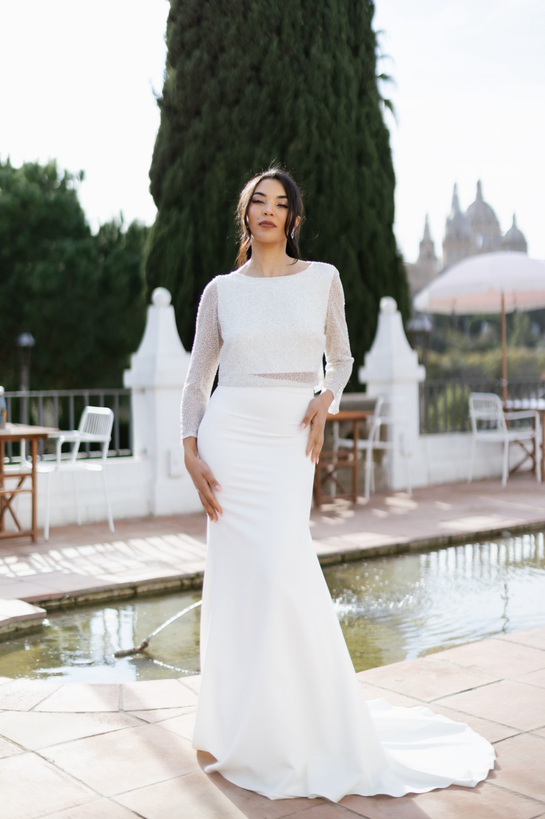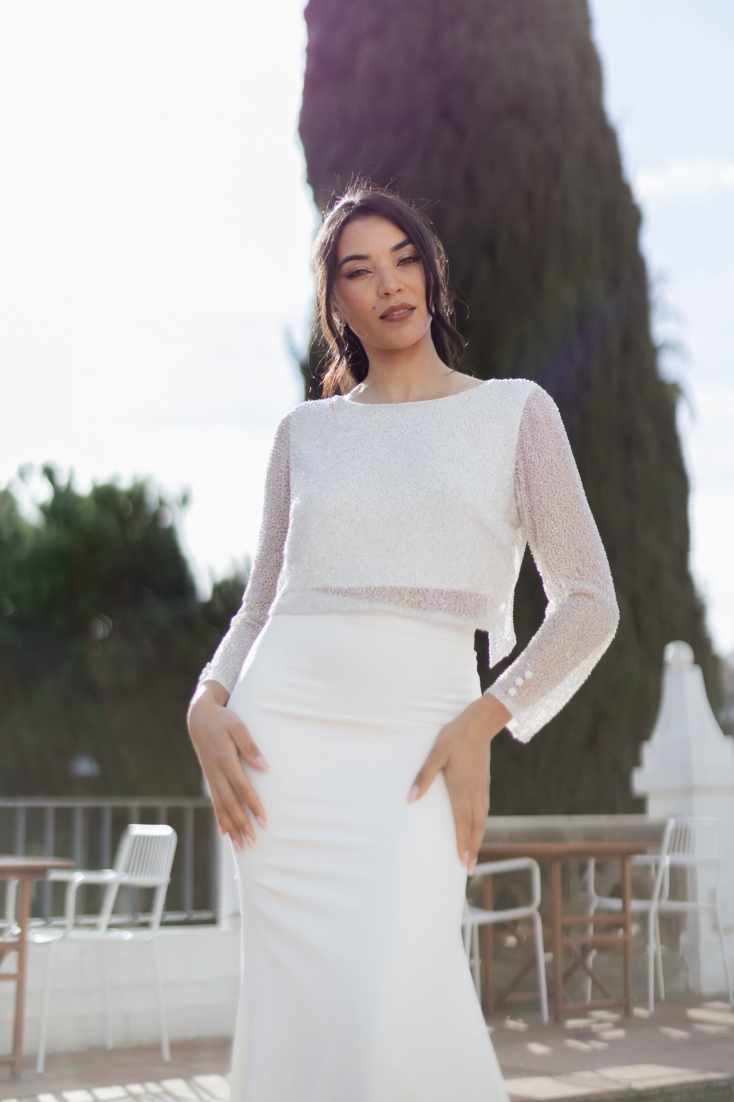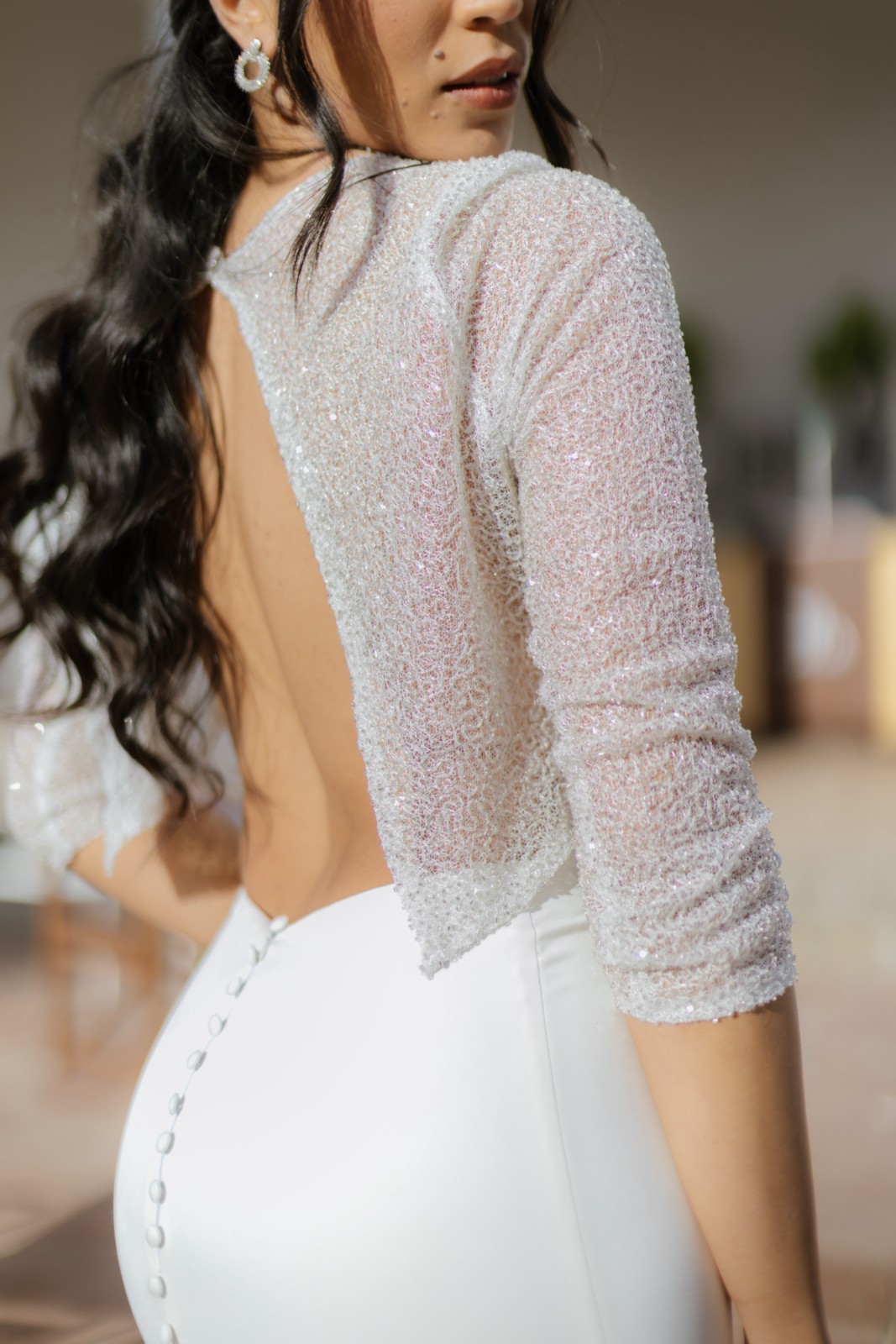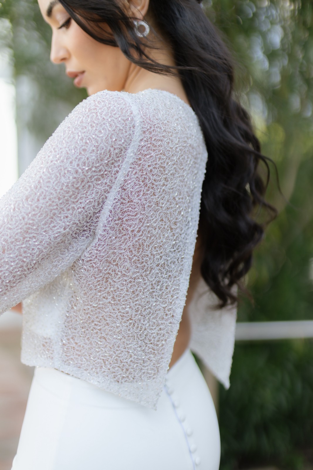 Top corto de pedrería fina con manga larga y escote en la espalda en forma de pico que la deja medio descubierta. Lleva detalle de botones en la manga para darle un toque más fino. Combinado con nuestra famosa falda Hilda de sirena tipo tubo y con cola, una delicia de conjunto.