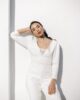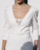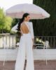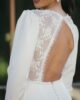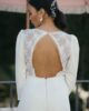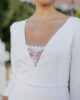Original mono con pantalón palazzo y manga larga abullonada con encaje bordado en el pecho. Tiene espalda en forma de pico invertido con encaje bordado semitransparente y un precioso abotonado. Ideal para novias que no quieren llevar vestido y quieren llevar un palazzo elegante y sofisticado.
