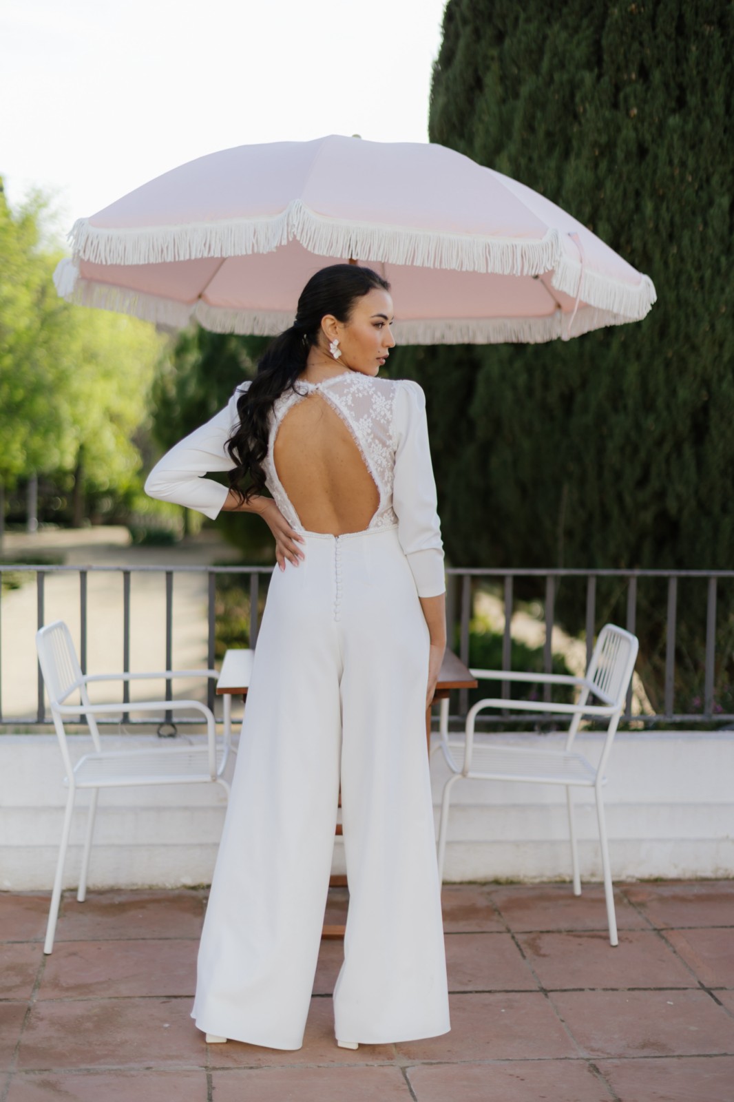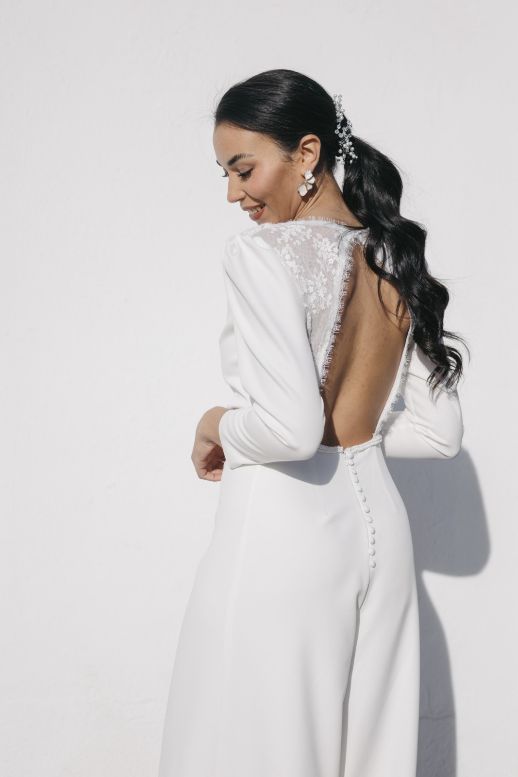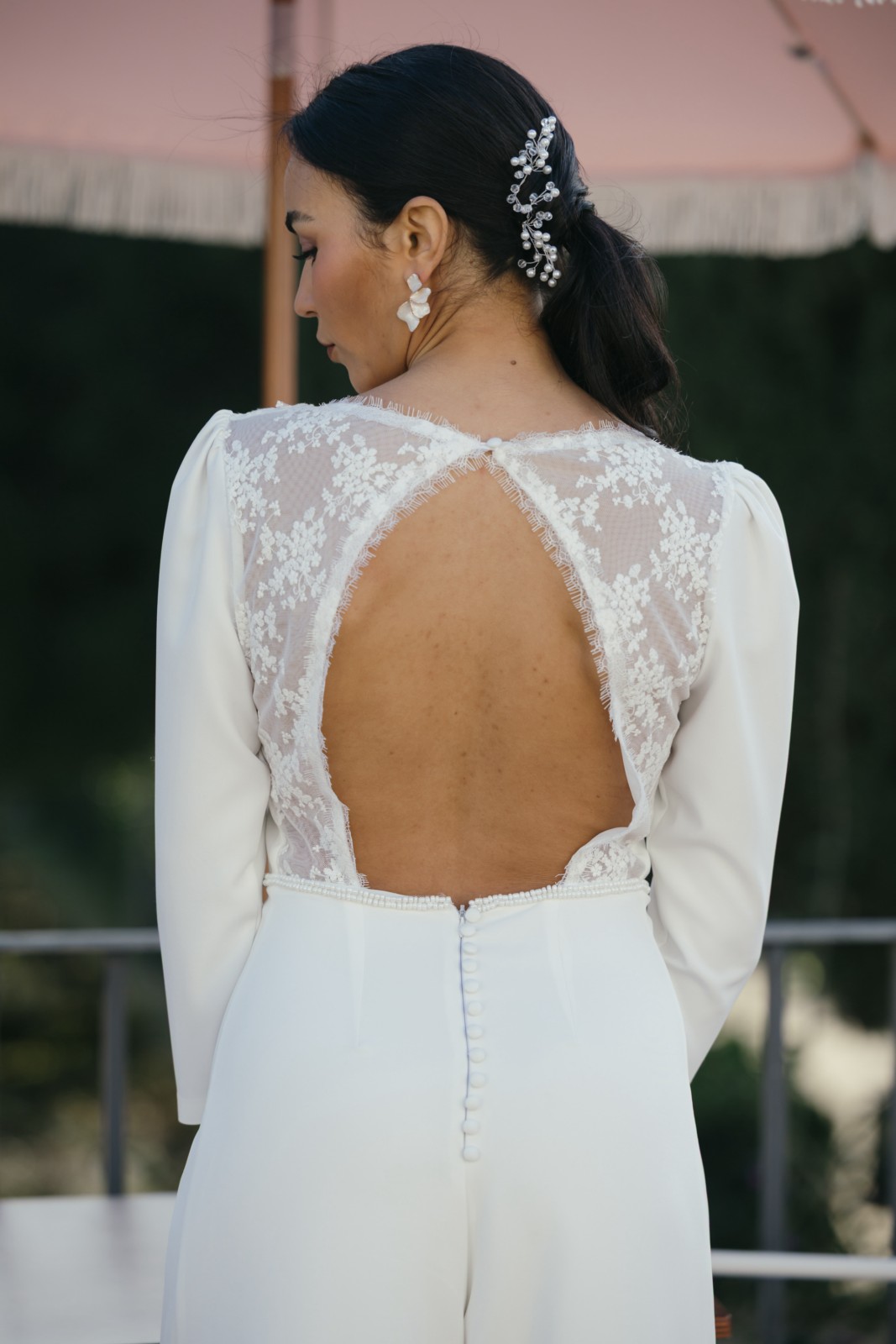 Original mono con pantalón palazzo y manga larga abullonada con encaje bordado en el pecho. Tiene espalda en forma de pico invertido con encaje bordado semitransparente y un precioso abotonado. Ideal para novias que no quieren llevar vestido y quieren llevar un palazzo elegante y sofisticado.