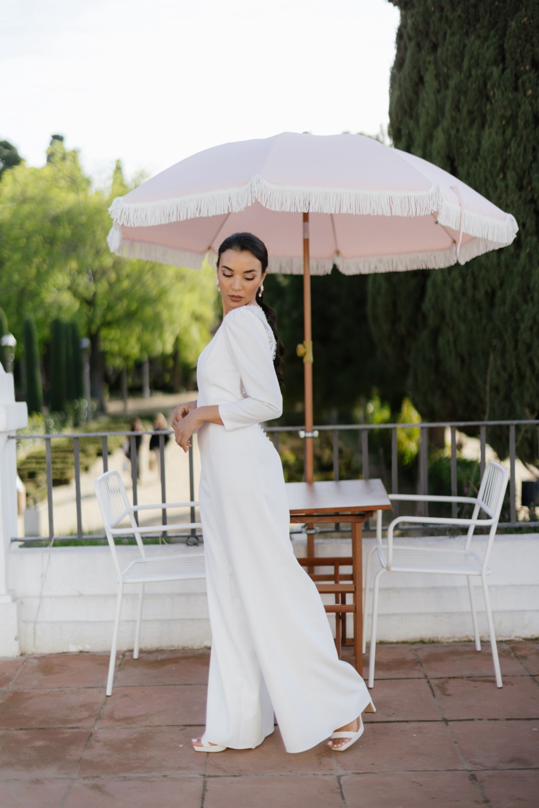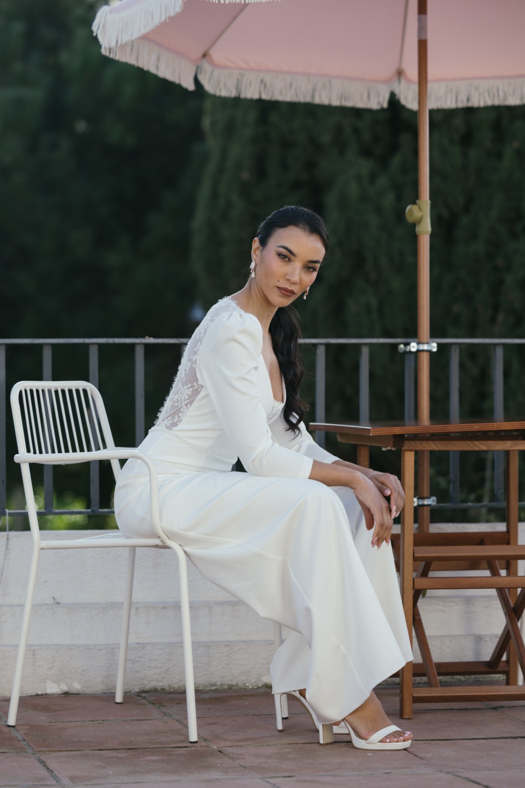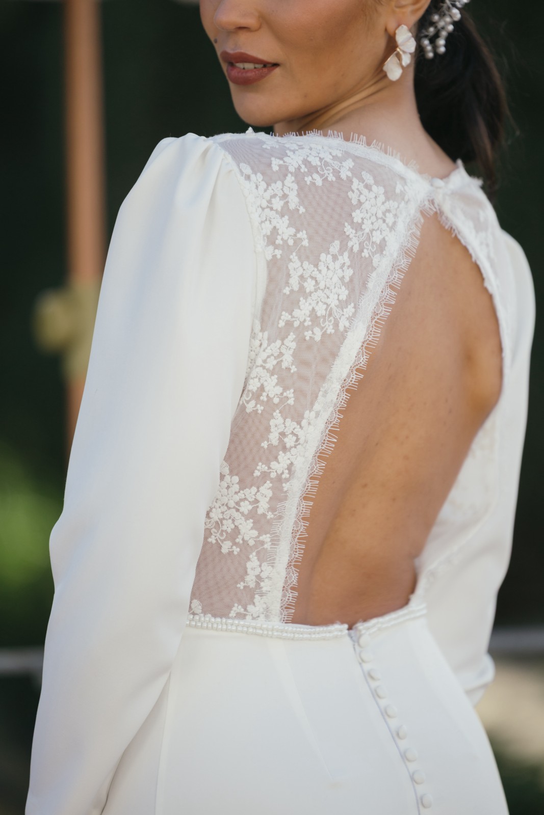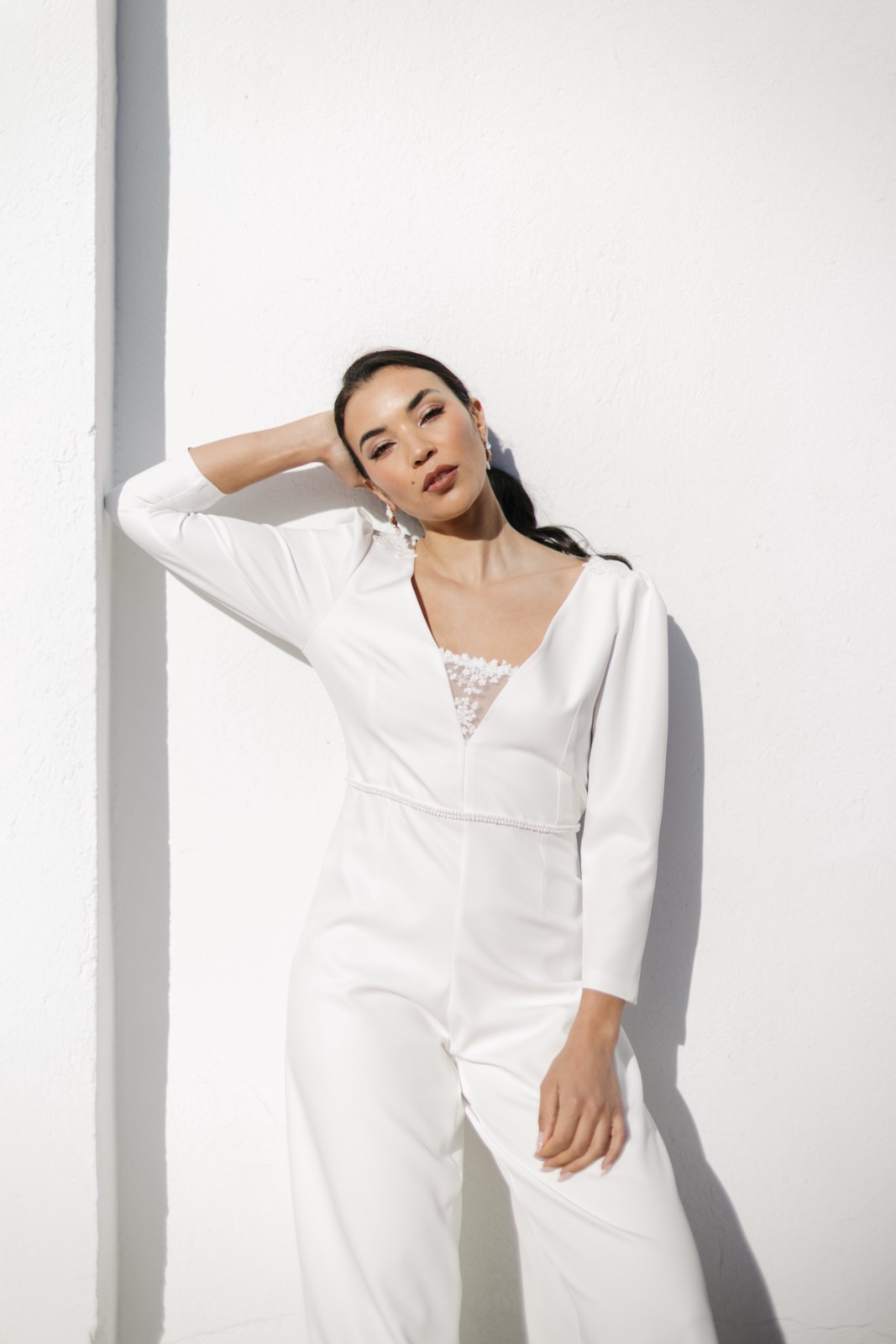 Original mono con pantalón palazzo y manga larga abullonada con encaje bordado en el pecho. Tiene espalda en forma de pico invertido con encaje bordado semitransparente y un precioso abotonado. Ideal para novias que no quieren llevar vestido y quieren llevar un palazzo elegante y sofisticado.