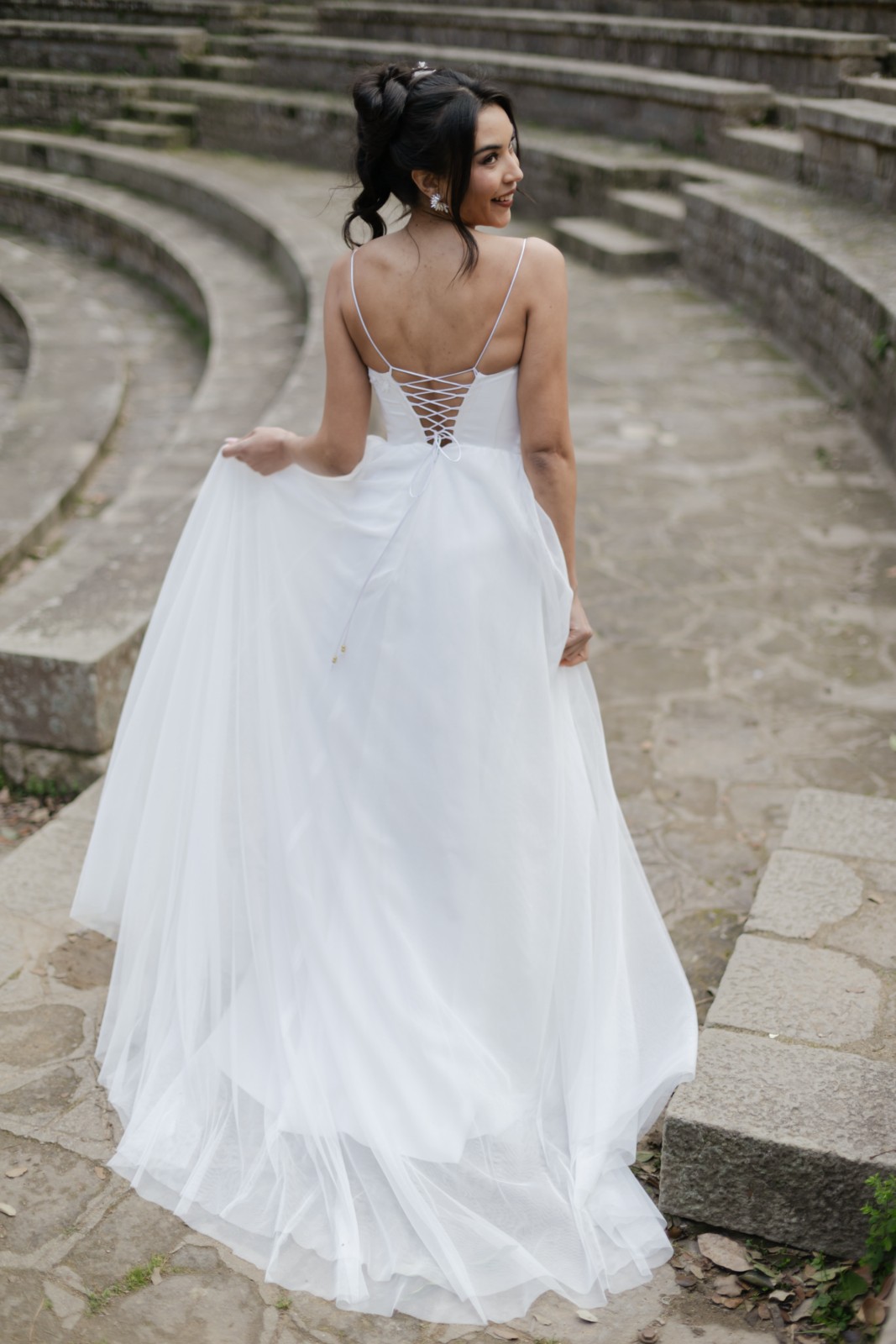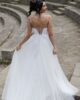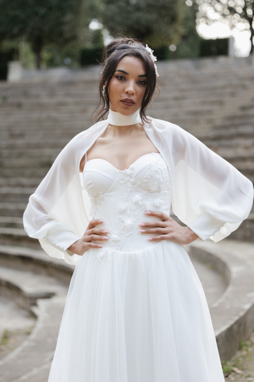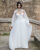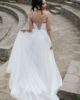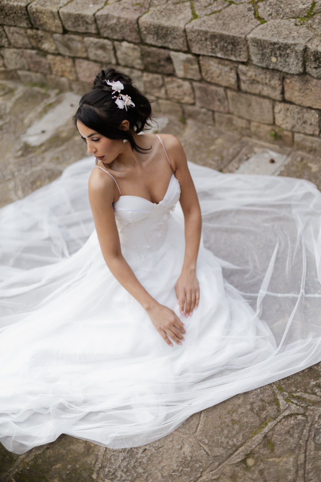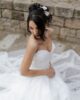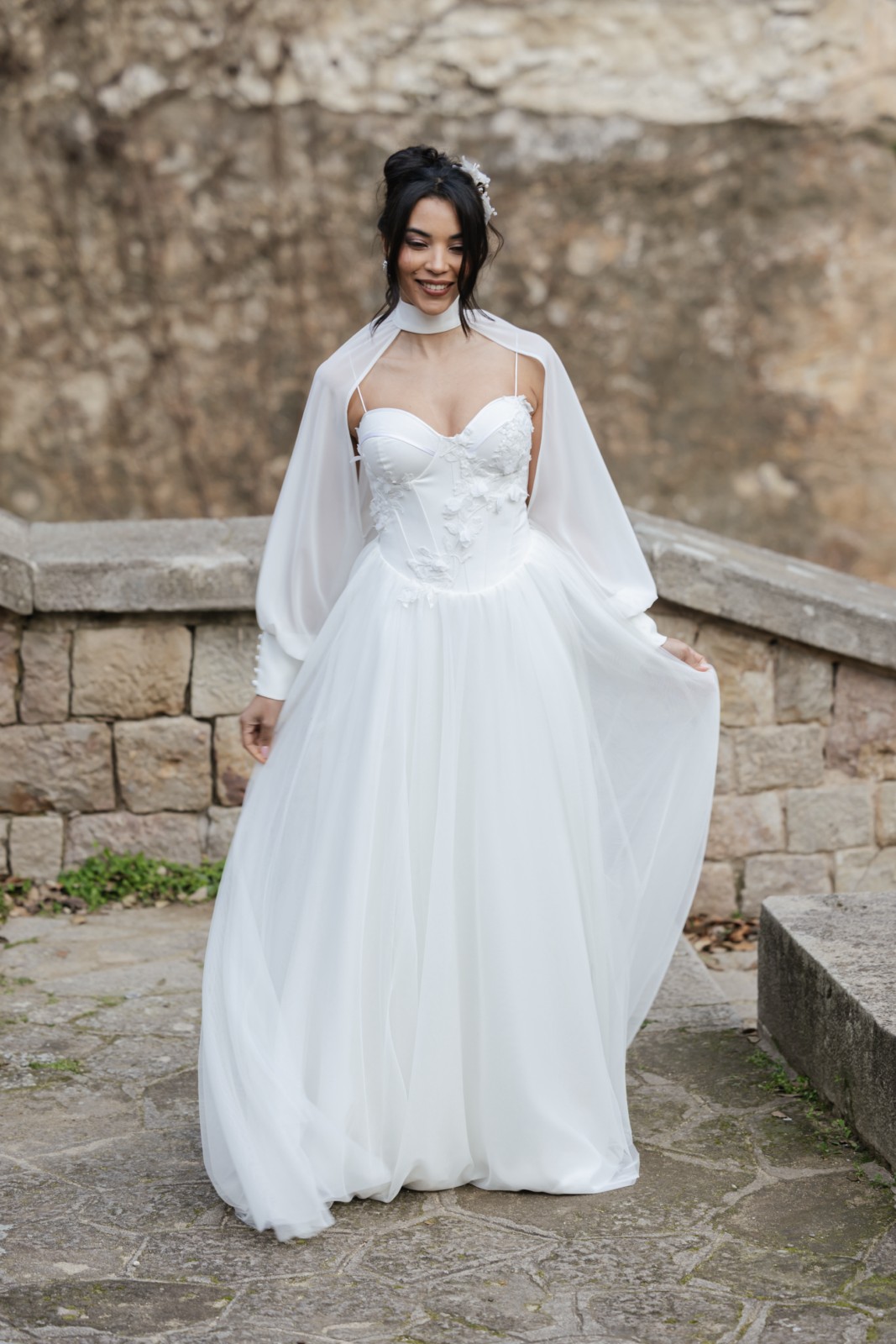 Espectacular vestido tipo corsé con escote corazón y flores bordadas cosidas a mano. Lleva una falda de tul con extra de capas al más puro estilo princesa. Ideal para novias atrevidas que buscan el toque princesa con un punto más moderno.