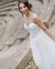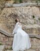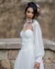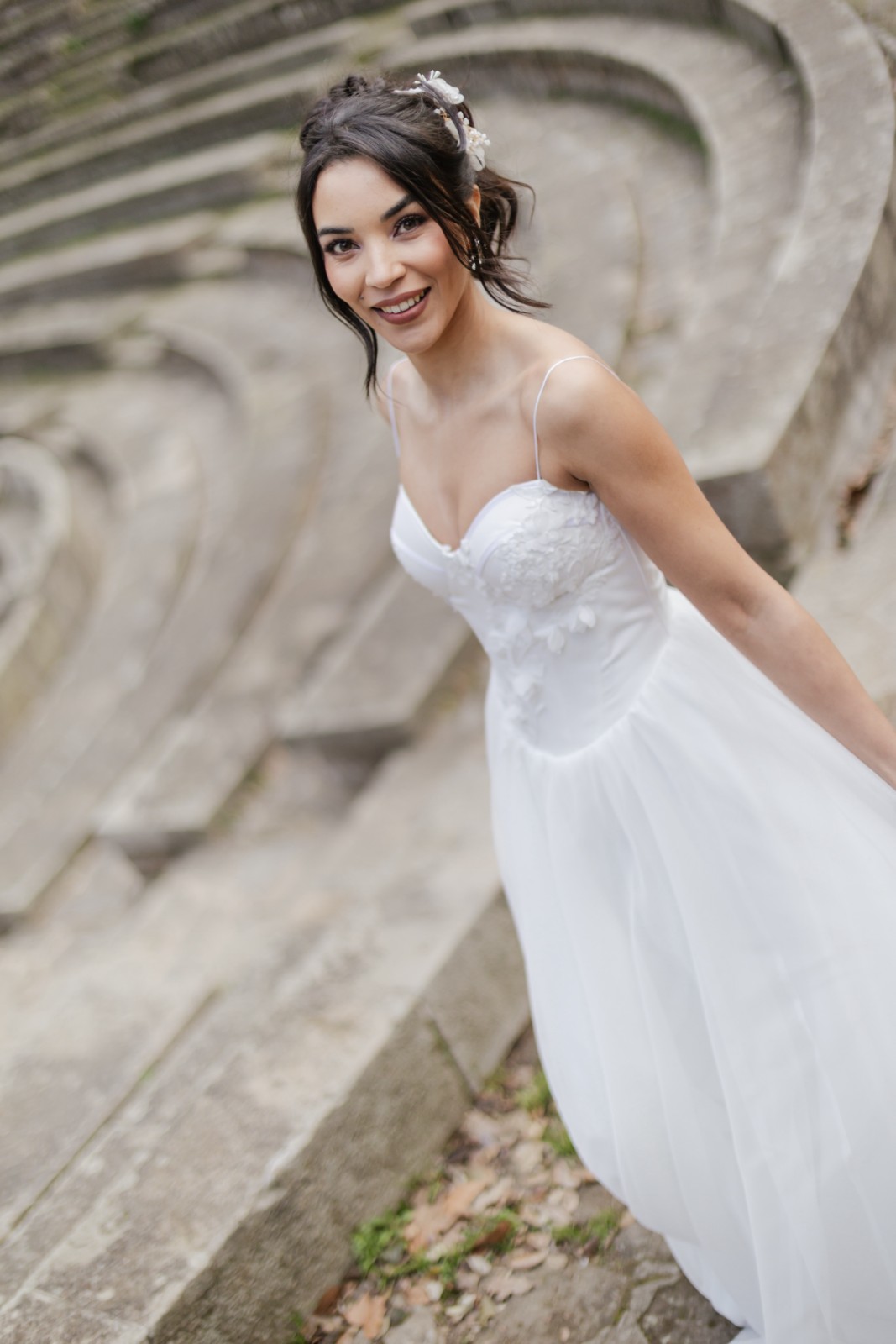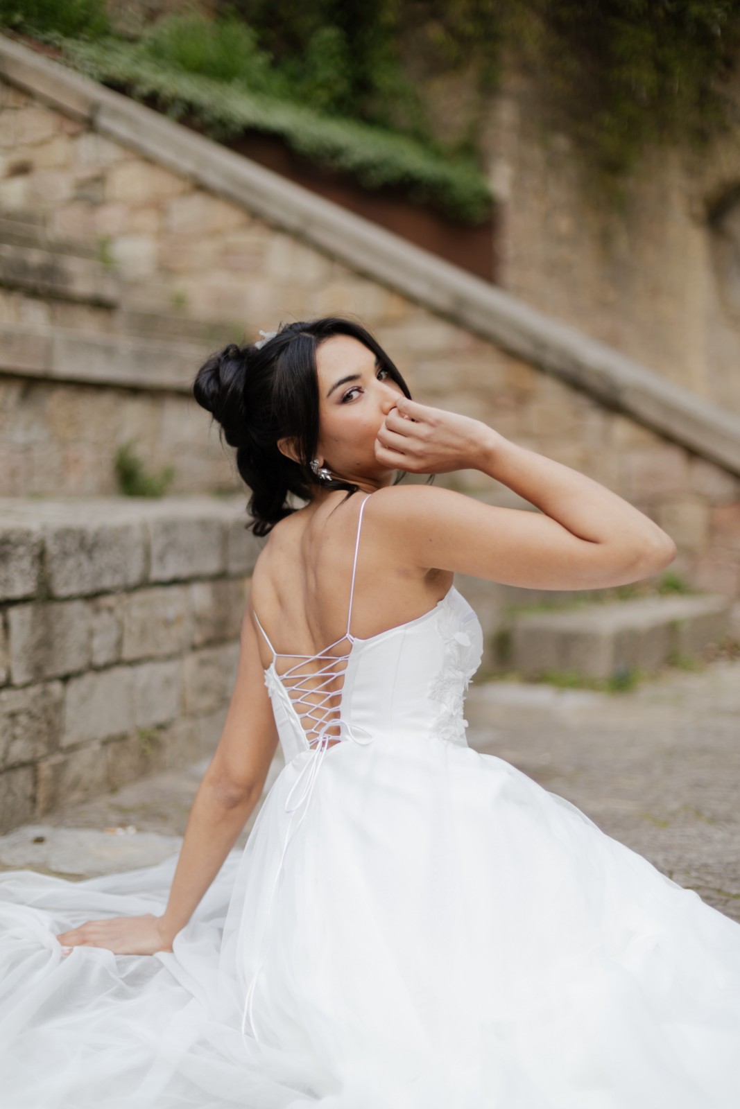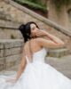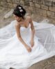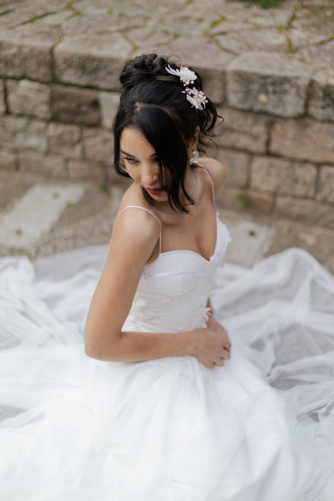 Espectacular vestido tipo corsé con escote corazón y flores bordadas cosidas a mano. Lleva una falda de tul con extra de capas al más puro estilo princesa. Ideal para novias atrevidas que buscan el toque princesa con un punto más moderno.