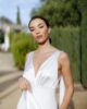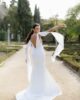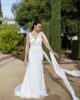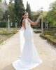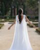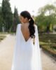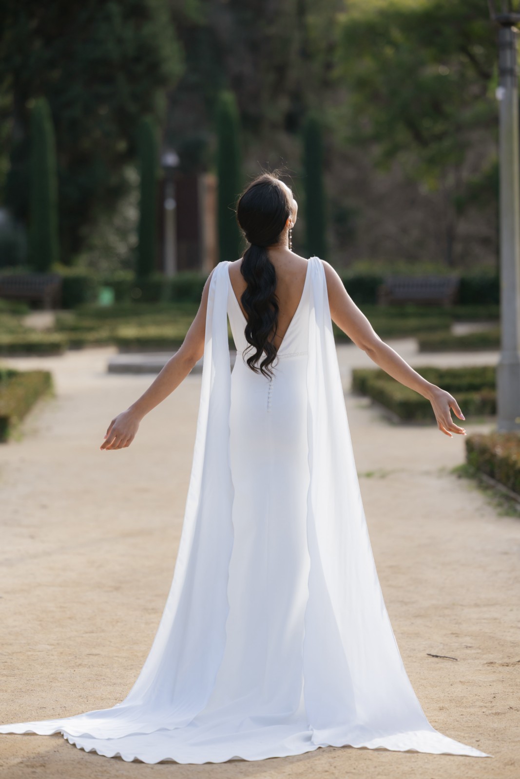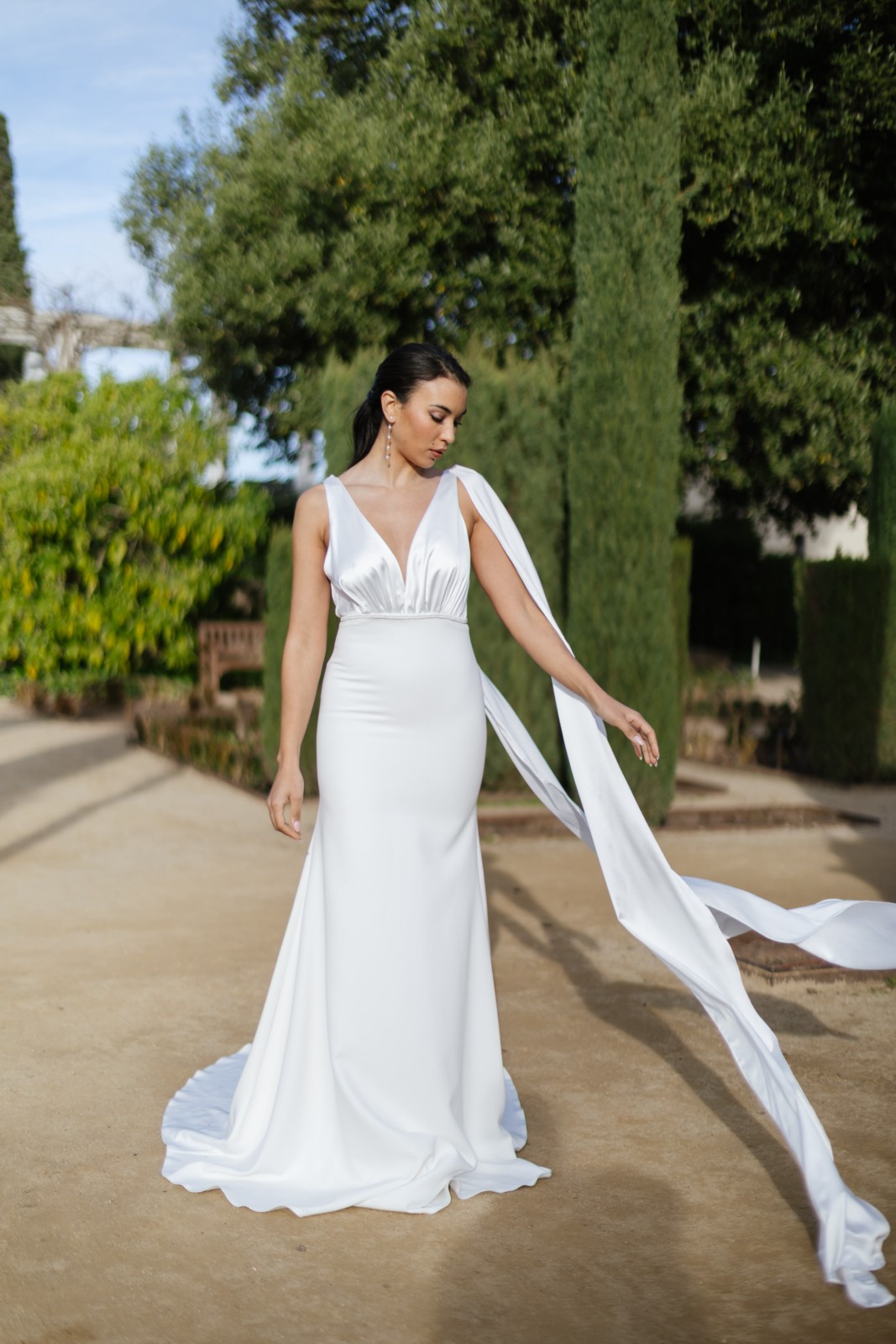 Precioso vestido ajustado con forma sirena con escote pronunciado en satén con dos alas que salen de los hombros hasta el suelo. Tiene una aplicación de pedrería fina en la cintura para darle el toque chic. Para novias que se quieren convertir en ángeles, pero sencillas y elegantes.