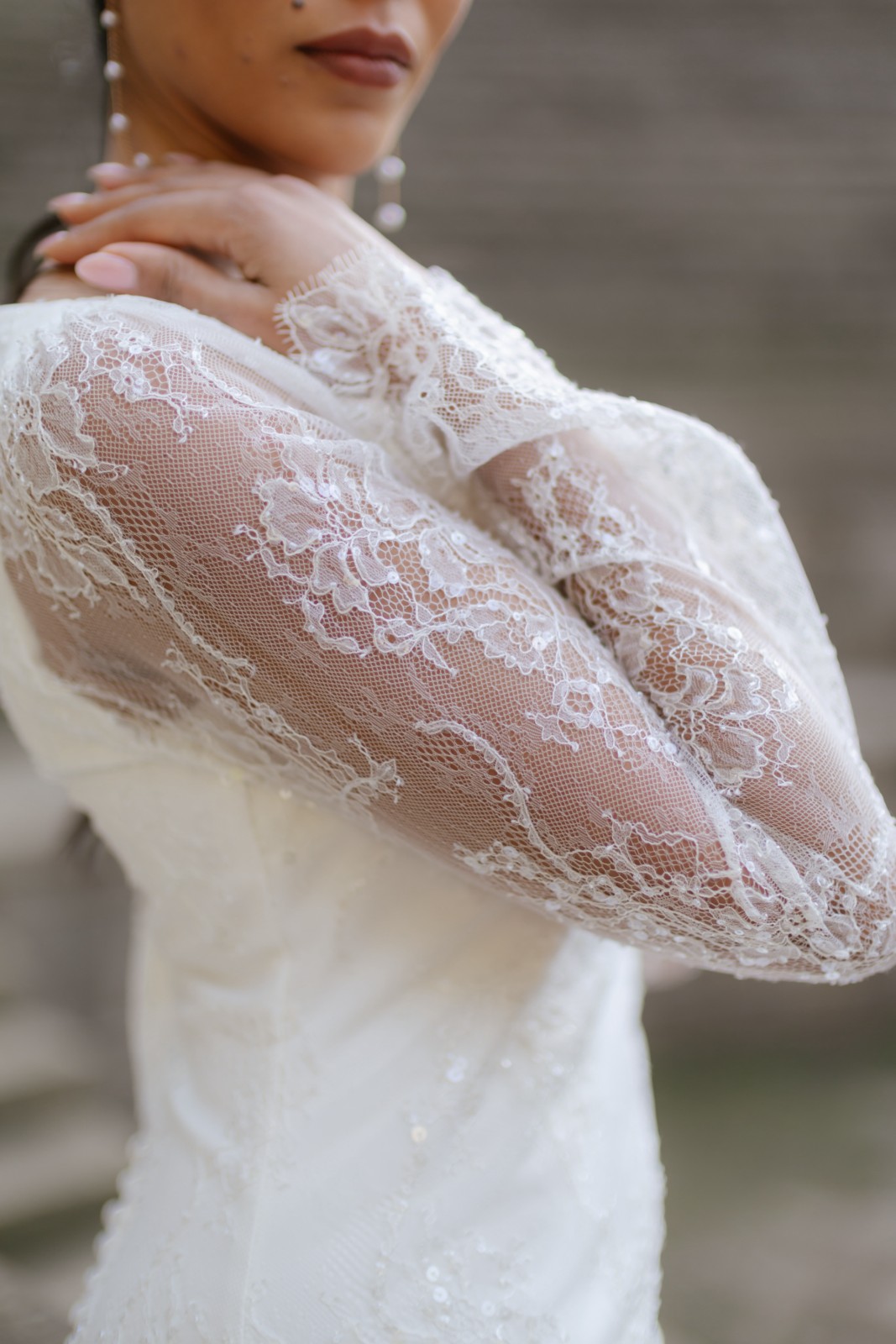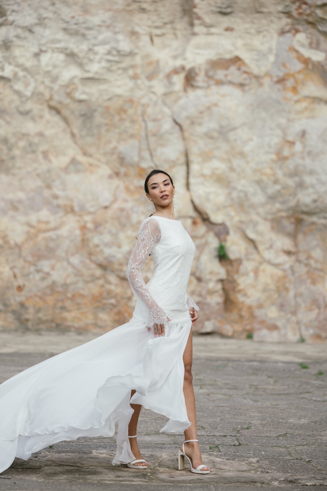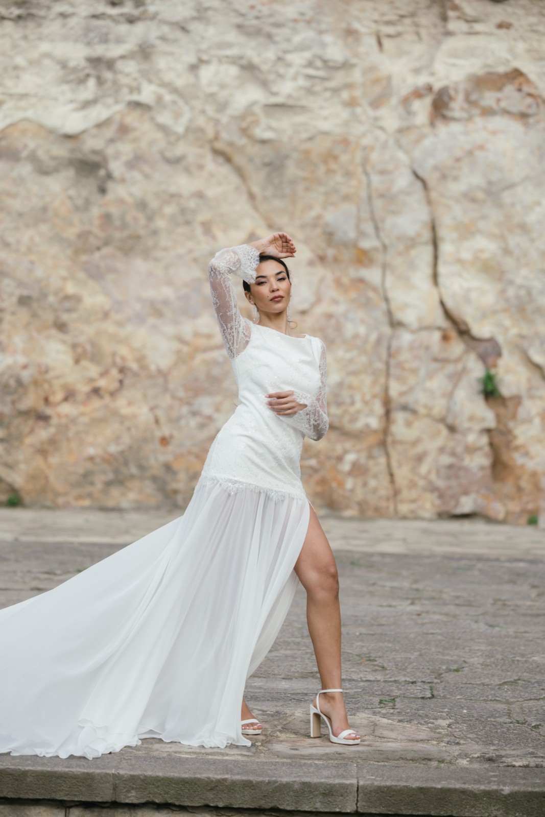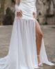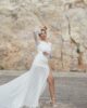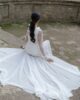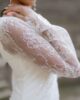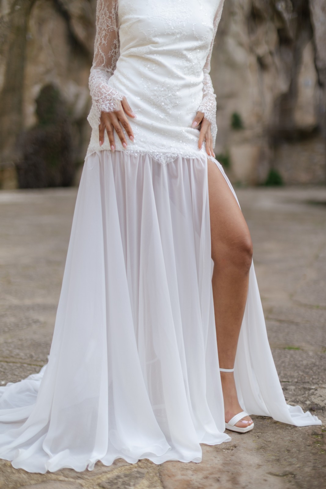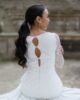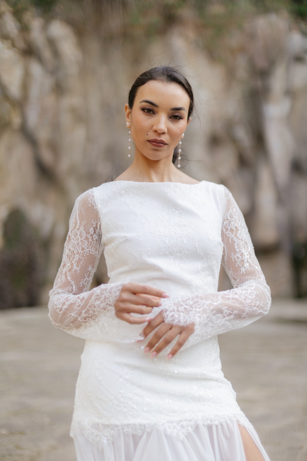 Espectacular vestido de chantilly en forma de tubo con la parte de la falda confeccionado en tul. Tiene manga larga acampanada de chantilly, una delicia para las novias más románticas y bohemias. La falda tiene cola y una abertura que le da el toque sensual para las novias más atrevidas.