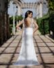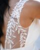 Precioso vestido lencero con escote en pico y flores bordadas con transparencia. La espalda tiene escote pronunciado con tirantes transparentes con flores bordadas. Ideal para las novias sencillas y románticas.