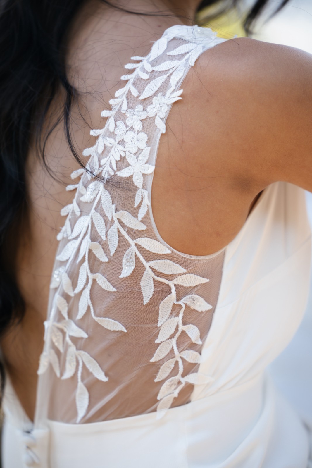 Precioso vestido lencero con escote en pico y flores bordadas con transparencia. La espalda tiene escote pronunciado con tirantes transparentes con flores bordadas. Ideal para las novias sencillas y románticas.